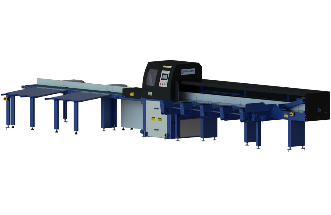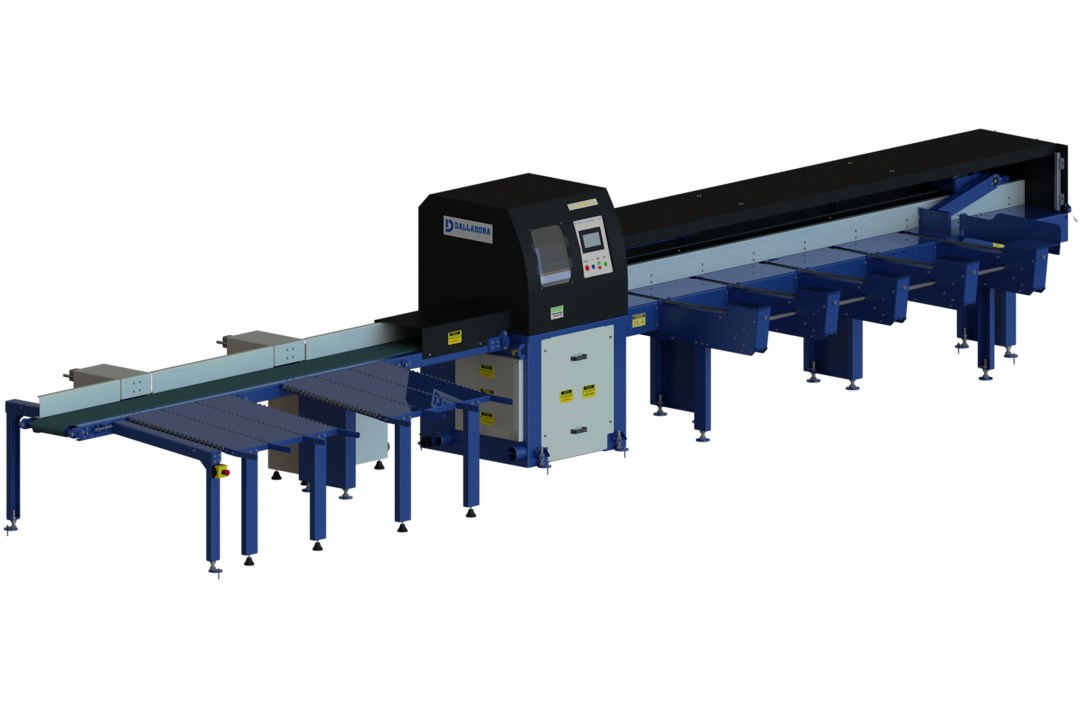 Projetada para destopo de madeira serrada. Realiza cortes em tábuas e longarinas com variado comprimento, largura e espessura. Efetua cortes de medidas programáveis no painel eletrônico, o avanço da madeira é automático.